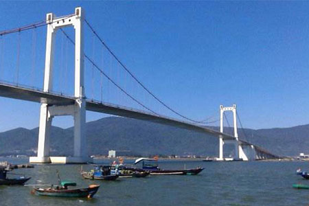 越南峴港順福大橋為三跨連續(xù)鋼箱加勁梁懸索橋,主跨405米、全長1856米,...