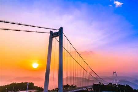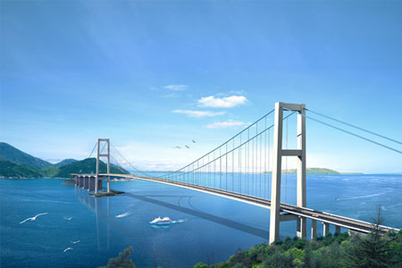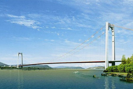 浙江岱山縣秀山大橋為全長3063米,主橋為跨徑926米的雙塔鋼箱梁懸索橋,按雙向...