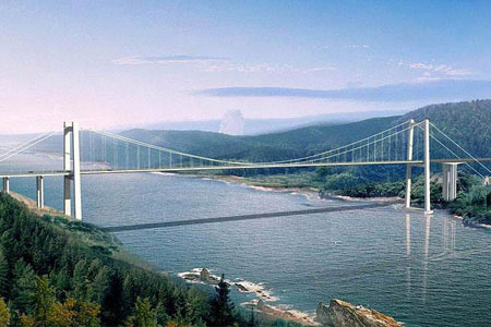 魚嘴長江大橋全長1438米,主橋為616米長的單跨懸索橋,...