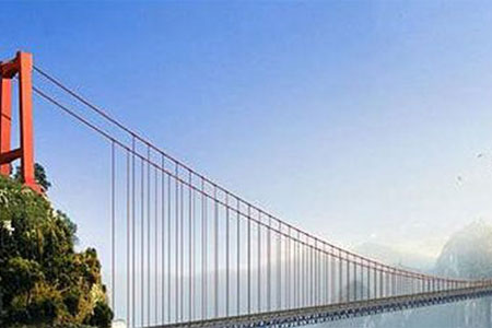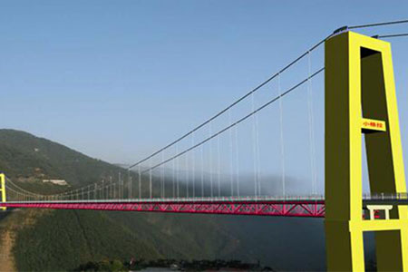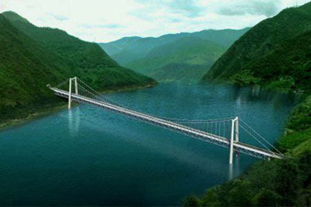 黃登水電站庫區(qū)小格拉吊橋橋梁主跨280m,橋型為加勁梁懸索橋。...