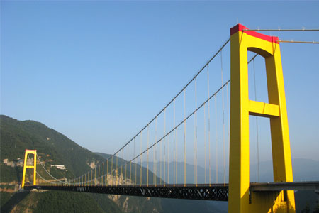 湖北四渡河特大橋全長1100米,主跨900米,被譽為世界第一高懸索橋。...