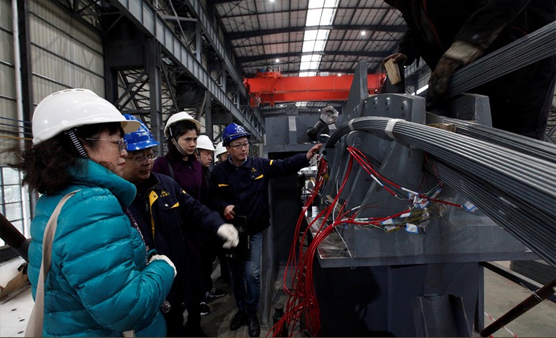 除索鞍索夾制造外,天元公司還承擔(dān)了陽寶山特大橋錨固系統(tǒng)研發(fā)及供應(yīng)、AS法的科研課題以及上部結(jié)構(gòu)施工等任務(wù)。驗(yàn)收組領(lǐng)導(dǎo)一行檢查了天元公司科研試驗(yàn)現(xiàn)場,并細(xì)致了解科研試驗(yàn)開展情況,對于科研課題的順利開展,驗(yàn)收組領(lǐng)導(dǎo)給予了高度的評價(jià)。